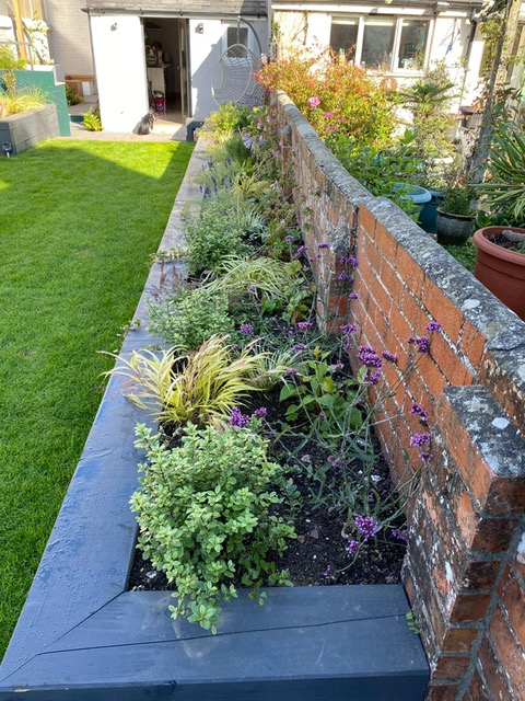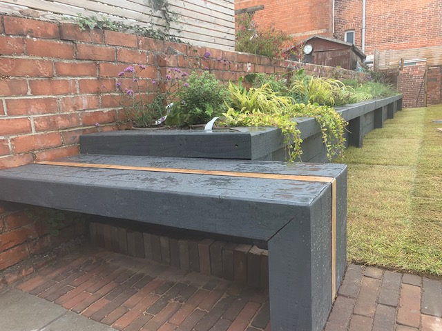 Raised sleeper beds were constructed in the lawn area not only to house the spoil generated from the project but provide height for the planting and places to relax for those enjoying something from the grill.