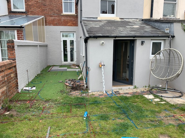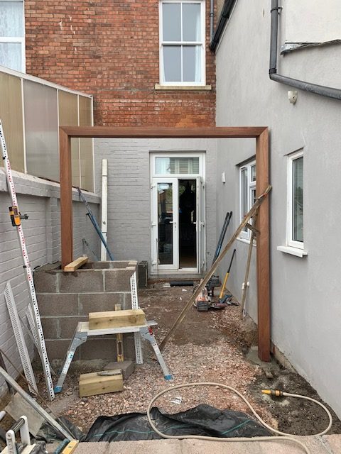 Continuing the theme, Sapele hard wood battens were used to produce the seating, screening above the sink area and the door to the cupboard. Once treated the colour complemented the clay pavers.