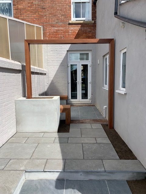 The Sapele hard wood arch gave height and structure to this garden without becoming too dominating and incorporated stainless wires running into the raised bed for climbers to grow up.