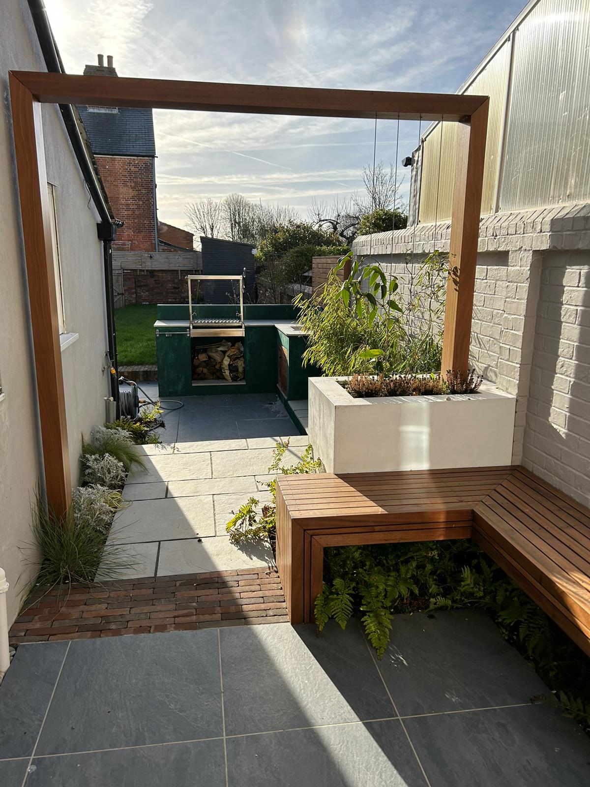 Given free rein for the design of this garden the brief was to provide an area not only to sit and relax in this South-facing garden but to cater for those times where friends and family can come and enjoy a BBQ on those summer evenings.